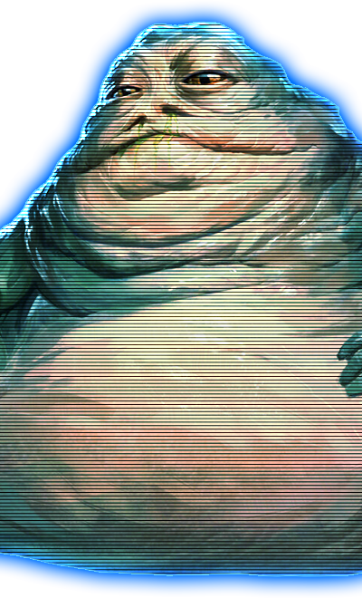 Saatjeekah Besh is a towering wall of muscle and mass, his immense form stretching nearly four meters in length. Unlike the more common greenish-brown Hutts, his leathery hide is a deep slate blue, marbled with streaks of ashen gray that coil around his bulk like ancient riverbeds. His wide, powerful tail is thick with layered muscle.